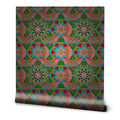 This wallpaper brings together lush florals and bold geometric patterns in a vibrant composition that commands attention.